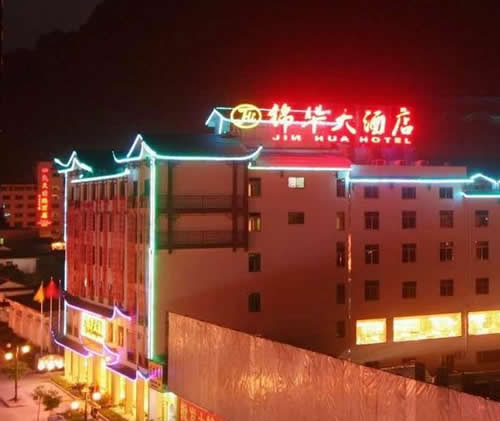 武陵源錦華大酒店是一家按國家四星級標準、2009年5月新修建成的豪華旅游度假酒店,地理位置優(yōu)越,位于武陵源汽車站旁.酒店集觀光旅游、度假、商務會議、品嘗土家美食等多功能為一體,酒店建筑融合張家界地區(qū)的民族風情和建筑文化,是張家界地區(qū)最有土家風情的星級酒店之一。 武陵源錦華大酒店安裝了數(shù)控中央空調系統(tǒng)、空氣源熱水系統(tǒng)。24小時供應冷熱水。 武陵源錦華大酒店擁有客房100間,其中套房3間、標準間96間、單人間1間,客房內配有液晶電視、閉路電視和寬帶接口;餐要包廂8個、豪華包相一個、極具當?shù)靥厣摹盎鹂游荨卑鼛?個、中餐宴會廳可同時容納300人就餐。酒店還配備一個高標準多功能的現(xiàn)代化會議室,安裝有電視電話會議系統(tǒng),可以舉行各種類型的中小型會議。