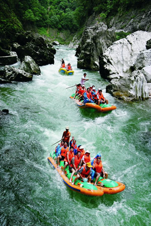 猛洞河水量豐富,河流坡降大,水急灘多浪奇,高大的峭壁直插水面,兩岸并相靠攏,形成幽深的峽谷景觀。沿河兩岸古木蒼天,蒼翠欲滴,奇石錯(cuò)落,流泉飛瀑隨處可見(jiàn),下游一路水碧山青,風(fēng)光秀麗,野猴成群,溶洞奇特。猛洞河天下第一漂項(xiàng)目位于猛洞河支流,全長(zhǎng)47公里,最精彩處位于哈妮宮至牛路河段,長(zhǎng)約17公里。該景區(qū)兩岸多為原始次森林,蔥蔥郁郁,水流湍急,碧綠清亮,有十里絕壁,十里瀑泉,十里畫(huà)卷,十里洞天的美譽(yù)。其中有急流險(xiǎn)灘108處,大小瀑布20處。漂流,穿急流,越險(xiǎn)灘,闖狹谷,捕激浪,有驚無(wú)險(xiǎn),回味無(wú)窮。特別是哈妮宮、三角巖、雞籠門、遇仙峽(捏土)、閻王灘、落水坑、夢(mèng)思峽、鯉魚(yú)剖肚、三大炮等景點(diǎn),無(wú)不令人叫絕觀止。