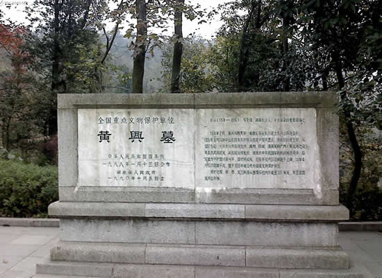 在岳麓山上。墓由三層臺階百余級踏步導(dǎo)入,墓碑為一四棱形的整塊4乳白色巖石琢成,全高約10米,因地處岳麓山高峰開闊處,顯得格外聳拔、挺秀、眺望湘江江,長沙景物盡入眼底。黃光(1874—1916),朱名軫,號杞園,又號克強(qiáng),湖南善化(今長沙)人,辛亥革命重要領(lǐng)導(dǎo)人,史有“孫黃”之稱。1904年組織華興會,翌年8月與孫中山、章太炎等人組織中國同盟會,曾生動并領(lǐng)導(dǎo)欽州、廉州(治今廣西合浦)、鎮(zhèn)獻(xiàn)花(今友誼關(guān))、河口、廣州等地區(qū)反清戰(zhàn)役起義,任民軍戰(zhàn)時總司令。南京臨時政府成立,任陸軍總長。袁世凱稱帝后,任討袁軍總司令。1914年赴美醫(yī)病,1916年病重回國,10月31日于上海病故,時年43歲,次年移柩長沙,國葬于岳麓山。為全國重點(diǎn)文物保護(hù)單位。
