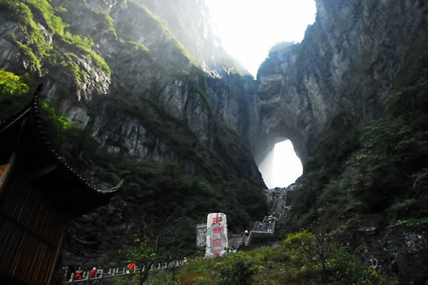 天門洞風光圖片 天門洞景觀 1700多年來,這一道奇絕天下的勝景吸引著無數的探訪者趨之若鶩。特別是在1999年,世界特技飛行大師駕機穿越天門洞,在全球引發(fā)了轟動效應,收看現場直播的觀眾達到8億之多。