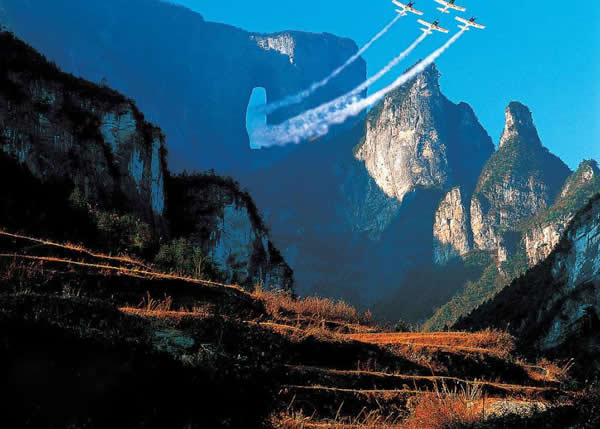 天門洞上空特技飛行表演 還有奇者,天門洞內一年四季總是雨珠滿空飄灑,這就是傳說中的天門洞“梅花雨”。這雨點清涼甘甜,是吉祥的象征,相傳誰要是用口接到四十八滴梅花雨,就能變成神仙。