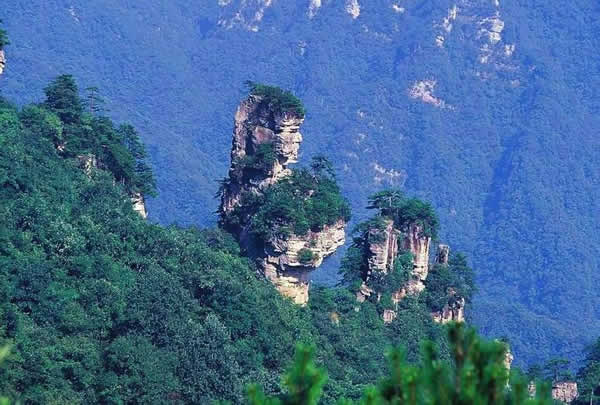 仙女獻花 出天子山賀龍公園大門東行不遠,正前方有三層峰群。其中一峰側面似少女,手捧花籃,面東而立,眉目清秀,線條分明,體態(tài)嬌娜。峰頂青松灌木似少女頭上的裝飾。整個造型優(yōu)美逼真,韻致殷然。它是天子山上的第一大精華景點。