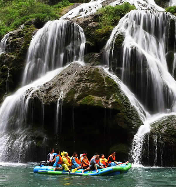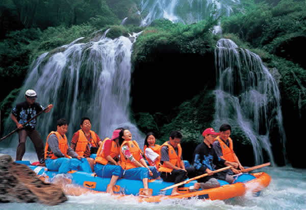 茅巖河漂流 茅巖河沿途的眾多飛瀑流泉中,尤以水洞瀑布最為壯觀迷人。瀑布從70多米高的峭壁瀉出,漫流過三級凸凹不平的峭壁,形成長短不一的三疊,瀑水在每級的石臺上漫過突兀出來的溝溝槽槽飛流而下,或?qū)捜玢y河,或窄似白練,或似垂掛的水簾,或似串串銀珠,飛落茅巖河中,撞擊得河水顫顫悠悠,鱗光閃閃。