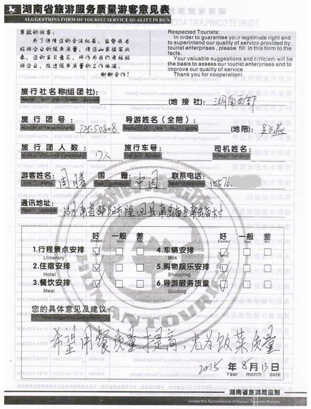 8月初,湖南邵陽周先生一行17位貴賓與湖南西部(張家界)中國國際旅行社工作人員——小王取得聯(lián)系,經(jīng)過商談,雙方達(dá)成協(xié)議并簽訂旅游合同,于8月9日抵達(dá)張家界,開始張家界之旅。此次行程是由我社優(yōu)秀導(dǎo)游——吳飛燕負(fù)責(zé)旅游接待工作,吳導(dǎo)在旅游過程中講解詳細(xì),客人也很滿意,在意見表上要求我們:希望用餐質(zhì)量提商,尤為飯菜質(zhì)量,我們感謝周先生為我社提出了寶貴意見,謝謝周先生。同時(shí)也感謝周先生選擇湖南西部(張家界)中國國際旅行社,以及您對(duì)湖南西部國旅的信任與支持。我們會(huì)繼續(xù)努力,做好旅游接待工作。期待下一次與您的合作,祝您愉快!