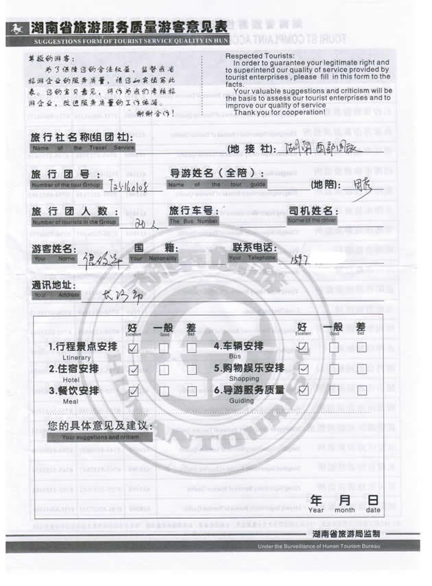 1月份,長(zhǎng)沙舒錦一行21位貴賓與湖南西部(張家界)中國(guó)國(guó)際旅行社工作人員——張群取得聯(lián)系,經(jīng)過(guò)商談,雙方達(dá)成協(xié)議并簽訂旅游合同,于1月8日抵達(dá)張家界,開(kāi)始張家界之旅。此次行程是由我社優(yōu)秀導(dǎo)游——田杉負(fù)責(zé)旅游接待工作,田導(dǎo)在旅游過(guò)程中講解詳細(xì),客人也很滿意。同時(shí)也感謝長(zhǎng)沙舒錦一行貴賓選擇湖南西部(張家界)中國(guó)國(guó)際旅行社,以及您對(duì)湖南西部國(guó)旅的信任與支持。我們會(huì)繼續(xù)努力,做好旅游接待工作。期待下一次與您的合作,祝您愉快!