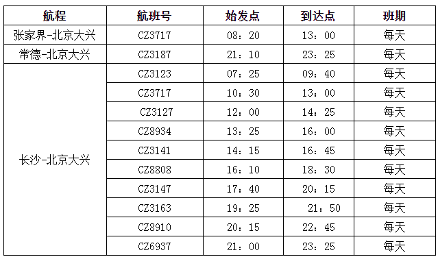 南航冬春換季后還全面優(yōu)化了各地往返北京大興的航線網(wǎng)絡(luò)。其中,張家界至北京大興航班為每天一班的朝發(fā)夕歸航班,去程CZ3717(張家界-大興)航班08:20張家界出港,回程CZ3164(大興-張家界)航班17:50北京大興起飛,時(shí)刻非常方便出行,張家界始發(fā)至大興單程僅450元起(不含稅)。常德每天往返北京大興1班;長沙每天往返大興10班(2班為寬體機(jī)),均提供“精品航線”服務(wù)。此外,北京大興往返廣州、深圳、上海、長沙、貴陽、珠海、?凇⑷齺、哈爾濱、大連、杭州、重慶、西安、烏魯木齊等全國主要城市均為早中晚全天候航班布局,方便旅客航空出行和中轉(zhuǎn)銜接。