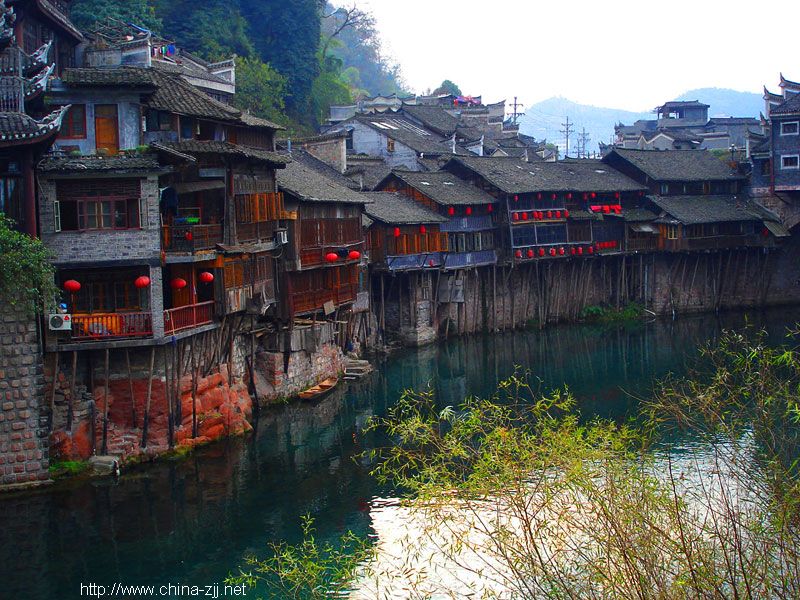 【鳳凰古城位于沱江之畔、群山環(huán)抱、關(guān)隘雄奇、碧綠的沱江依著城墻緩緩流淌,疊翠的南華山麓倒映江中,江中漁舟游船數(shù)點(diǎn),山間暮鼓晨鐘兼鳴,懸崖上的吊腳樓輕煙裊裊,碼頭邊的浣紗姑笑聲朗朗,兩岸已有數(shù)百年歷史的吊腳樓更是別有一番風(fēng)味;順?biāo)麓┻^虹橋一幅江南水鄉(xiāng)的畫面便展現(xiàn)于眼前--萬(wàn)壽宮、萬(wàn)名塔、奪翠樓……一種遠(yuǎn)離塵世的感覺悠然而生;鳳凰--猶如“一幅濃墨淺彩的中國(guó)山水畫”】