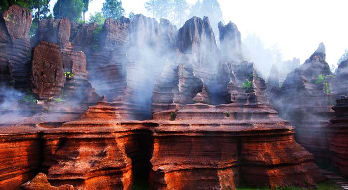 走進(jìn)古丈紅石林國家地質(zhì)公園,就如同走進(jìn)了一個(gè)夢(mèng)幻般的世界,成柱成片的紅色石林、石崖、石墻、石峰,分布在群山峻嶺之中。石林造型千姿百態(tài),有的象總統(tǒng)頭像,巨人屹立,有的如神龜探海,鷹擊長空;有的像紫荊花怒放,海洋冰床,有的像城堡峰塔,大廈高樓,有的如樓蘭古城、駝鈴聲聲,有的像乳燕待哺、蝸牛搬家、有的如七彩迷宮、利劍刺空;有的像航母巡游、石兵列陣;有的如少女出浴、觀音坐蓮;有的像石鞭候主、靈龜探海;有的如棕熊迎客、天狗吠日;有的如水獺望云、母雞搗窩……尤以“大地劇場(chǎng)”、“巨人園”、“古城故宮”為奇石絕景中的最佳。